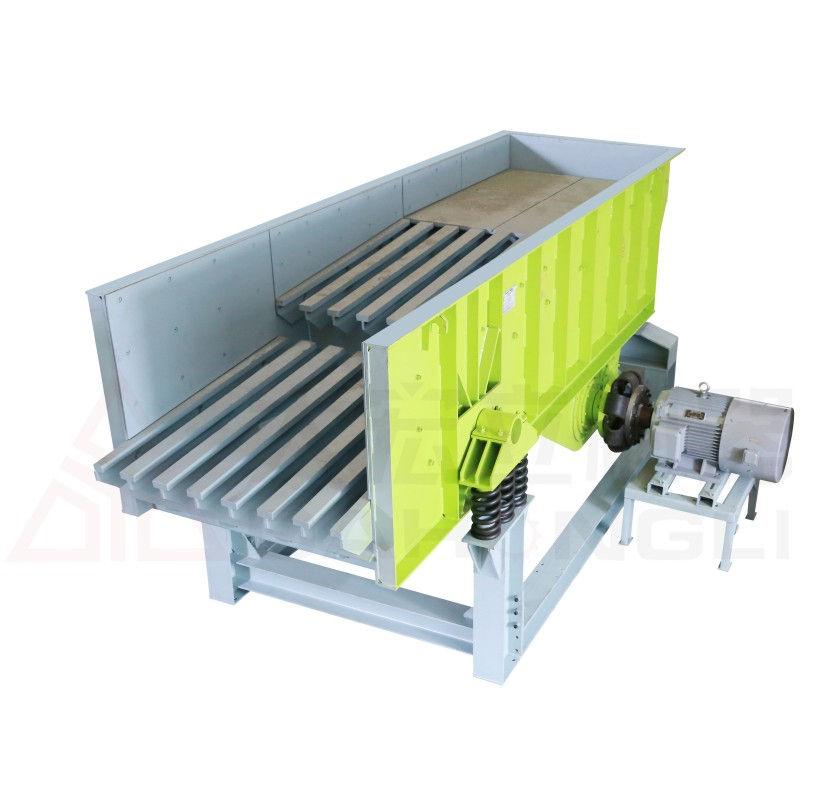 ZSW系列振动给料机是由料槽体、激振器、弹簧支座、传动装置等组成,槽体振动给料的振动源是激振器,激振器是由两根偏心轴(主、被动)和齿轮副组成,由电动机驱动主动轴,再由主动轴上的齿轮啮合被动轴转动,主、被动轴同时反向旋转,槽体振动,使物料连续不断流动,达到均匀给料及粗筛分的目的。